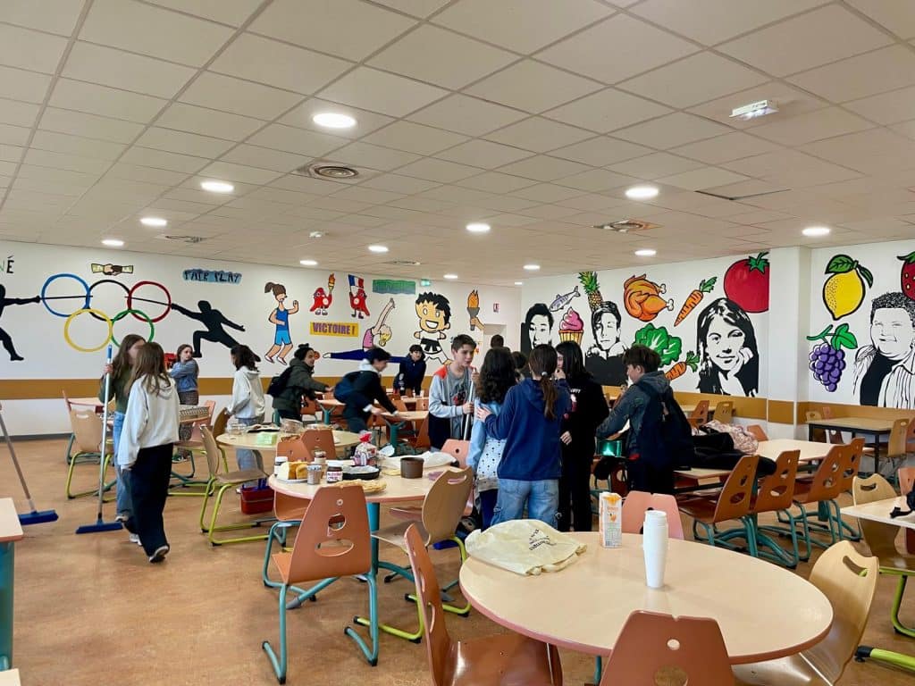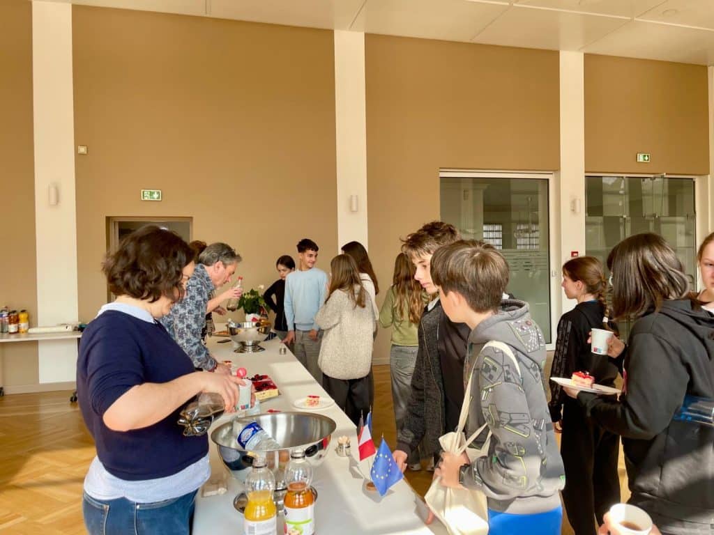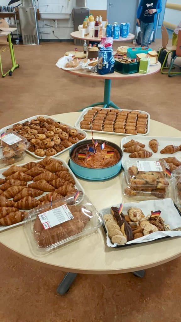 Danach sind wir in die Mensa gegangen, wo die französischen Austauschschüler schon ein Buffet mit Croissants, Pain au Chocolat, Crêpes und noch andere Sachen hergerichtet haben.