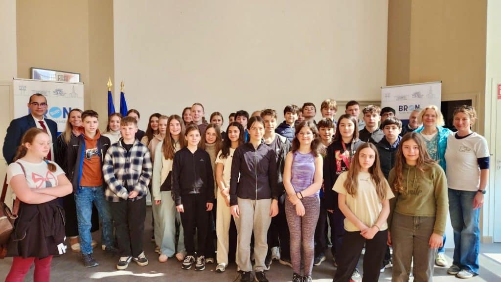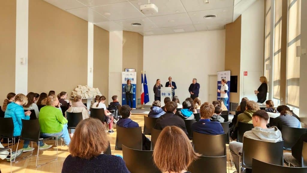 Wir sind dann alle zusammen ins Rathaus, wo es auch ganz toll war. Frau Paul und der Direktor vom Collège Pablo Picasso haben eine Rede gehalten und anschließend haben wir jeder eine Tasche mit Geschenken bekommen: Jetzt haben wir alle ein schönes Bron-T-Shirt. Außerdem gab es wirklich leckeren Kuchen!