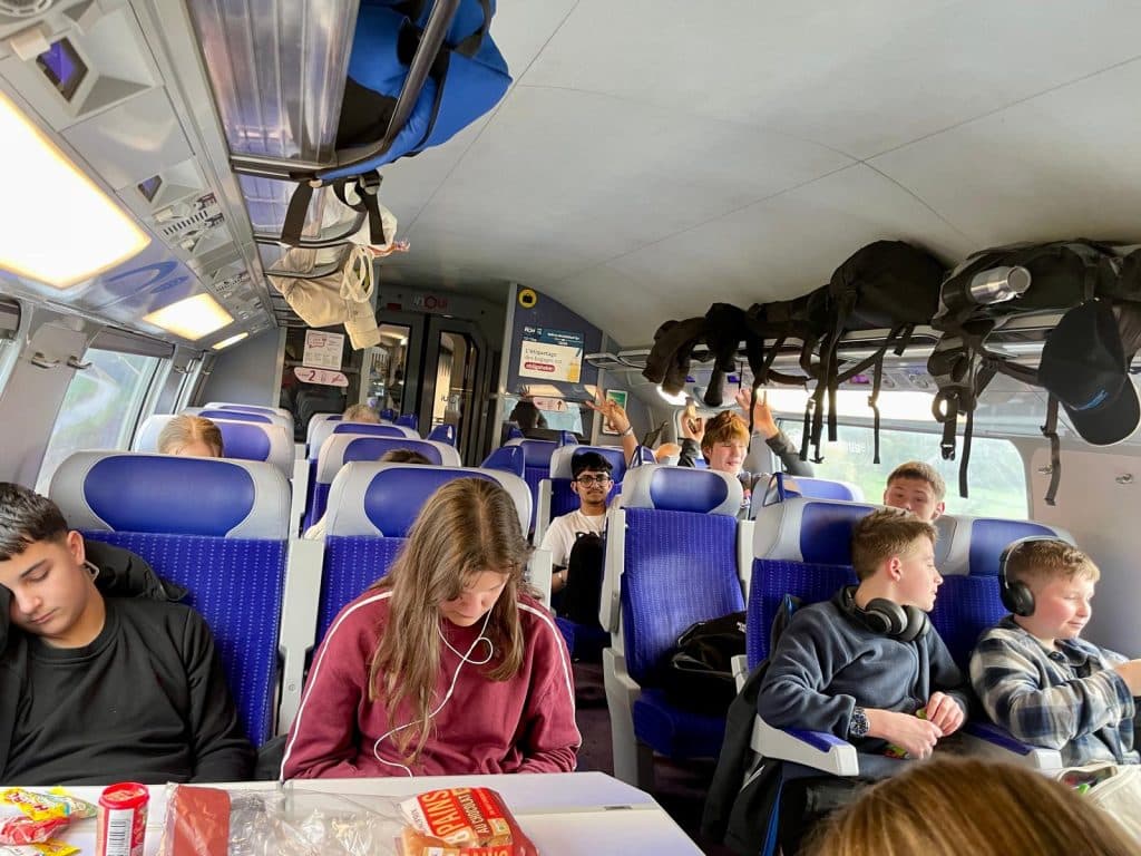 Am Donnerstag um 10:00 Uhr, startete die Reise nach Frankreich am Bahnhof in Ravensburg. Alle verabschiedeten sich von ihren Eltern und waren schon gespannt auf die Reise. Um 10:19 ist der Zug nach Ulm losgefahren. Von dort sind wir mit dem nächsten Zug nach Mannheim gefahren und haben dort den TGV nach Lyon genommen. Die Fahrt war entspannt und lustig. Es wurde gelacht und Witze gemacht. Um etwa 19:58 ist der TGV in Lyon angekommen. Dort haben uns unsere Gastfamilien abgeholt, und wir sind mit ihnen nach Hause gefahren. Den Abend hat dann jeder in seiner Gastfamilie verbracht.
